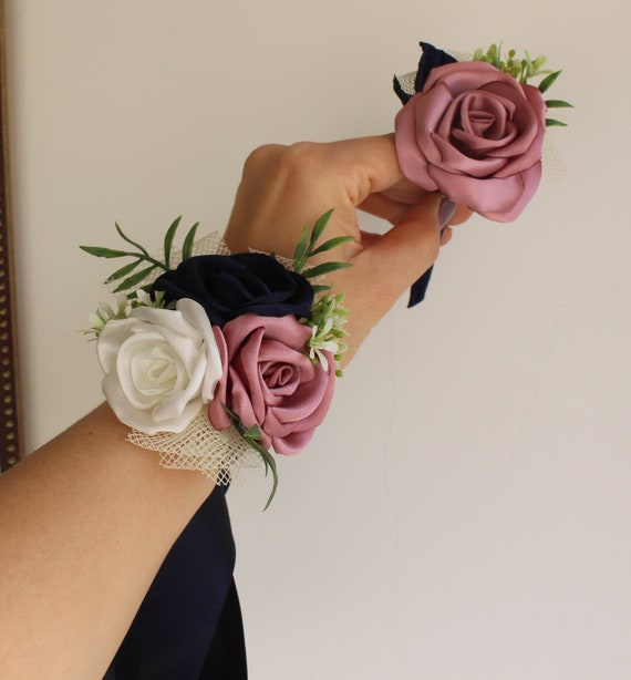 Navy Blue Dusty Rose Ivory Wrist Corsage Boutonniere Set Etsy