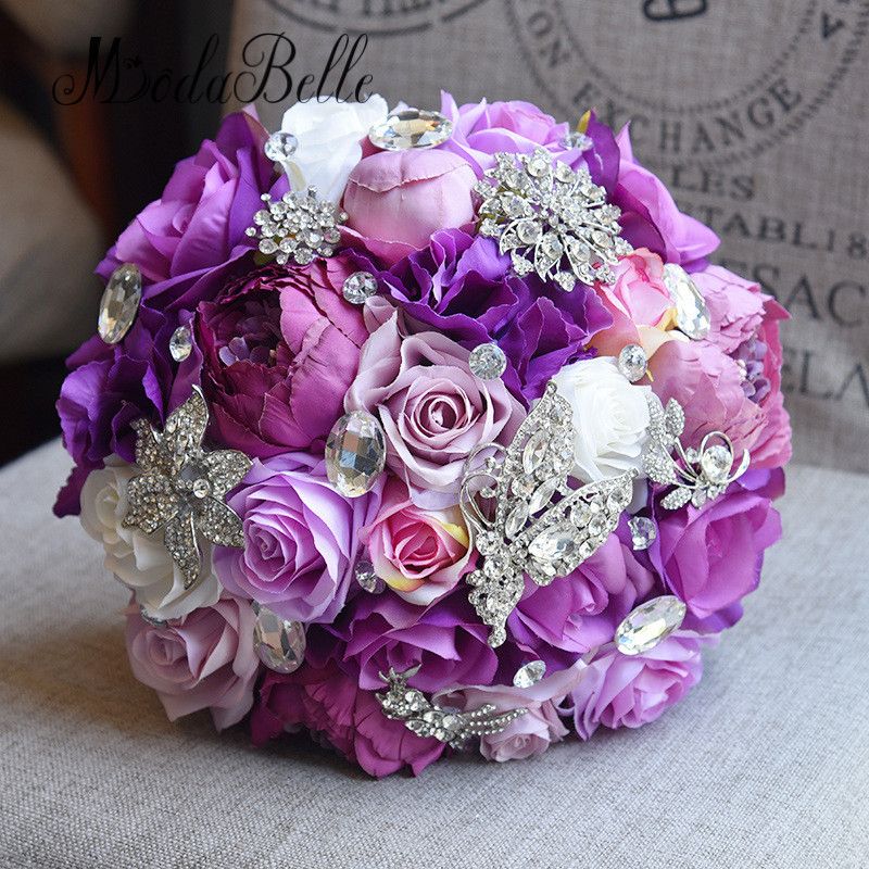 Brides Purple Diamante Silk Rose Wedding Bouquet With Crystals