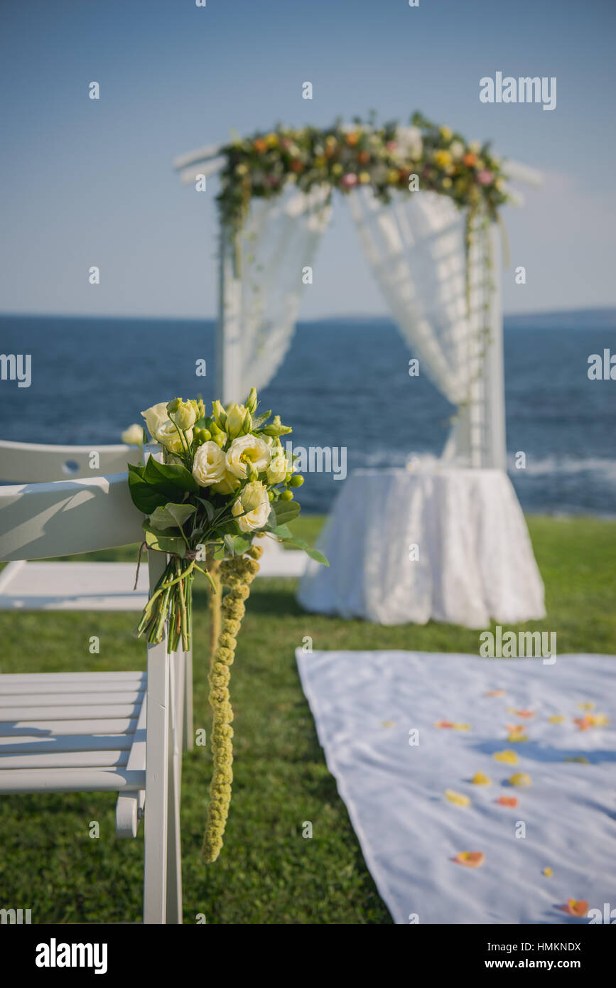 Wedding Ceremony Flowers Arch Chairs With Black Sea In The Stock