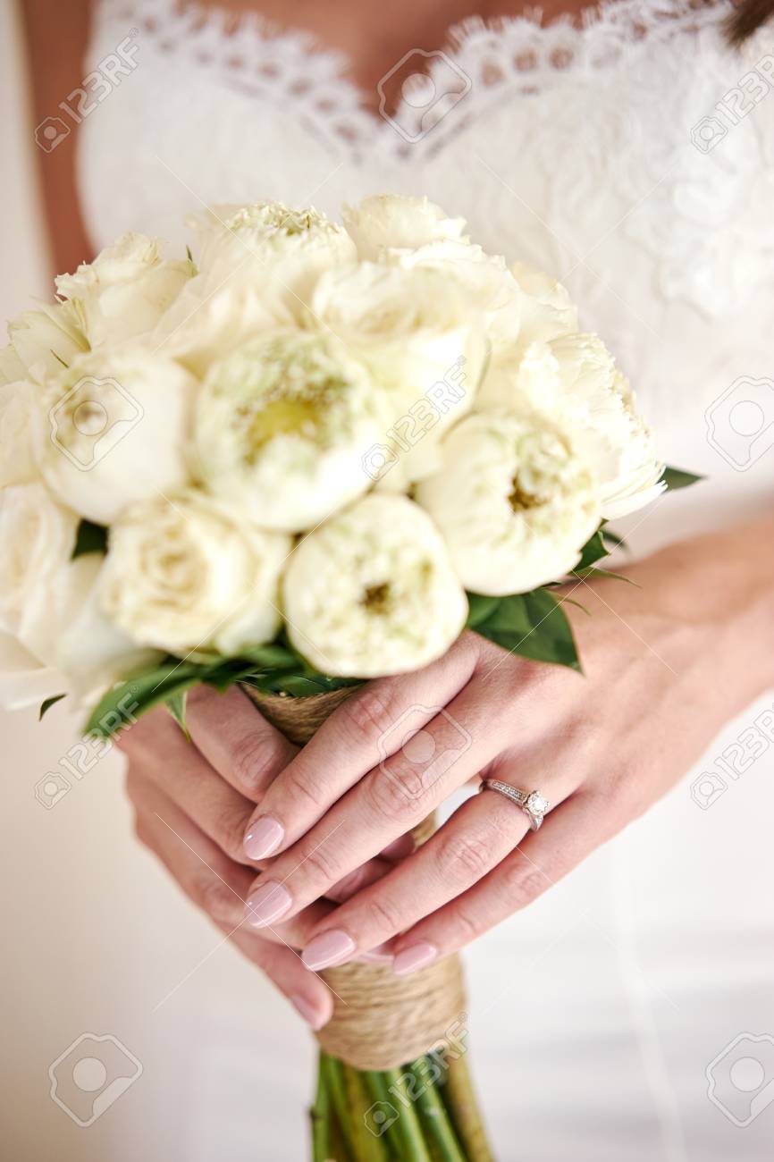 The Bride Hand With Wedding Ring Holding The White Cream Lotus