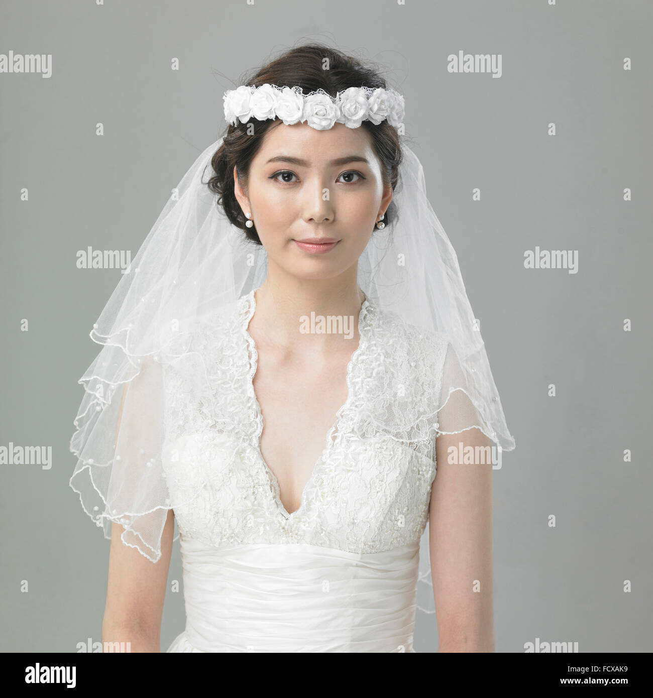 Bride In Flower Crown And Lace Veil Staring Forward Stock Photo