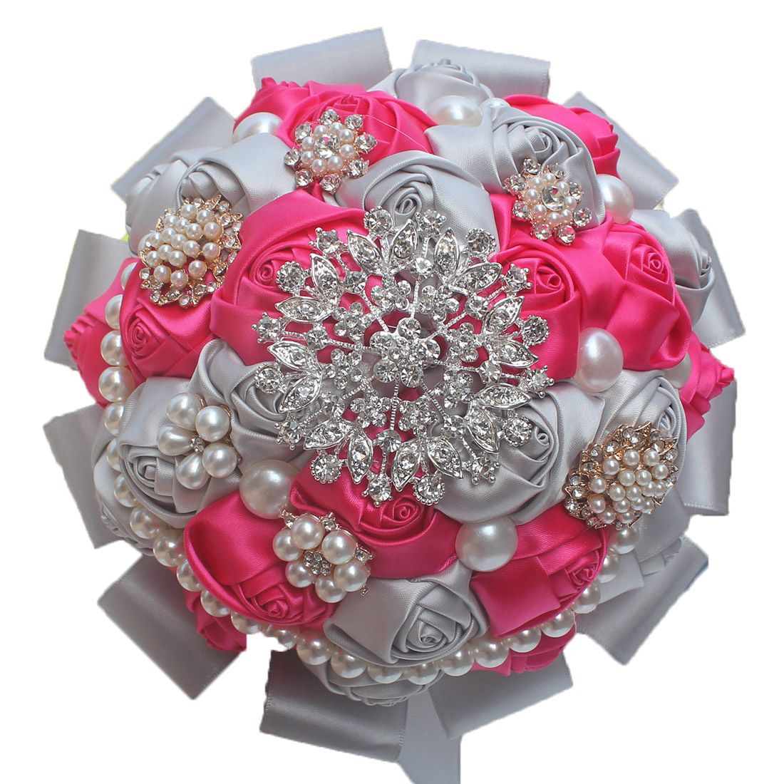18cm Wedding Bridal Bouquet Hot Pink And Silver Silk Rose Wedding