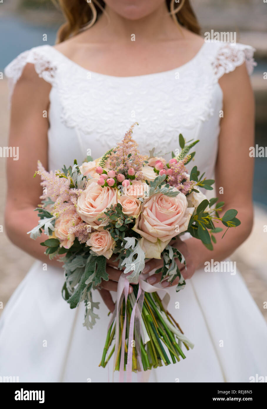 The Bride Holds A Pink Peach Wedding Bouquet Stock Photo
