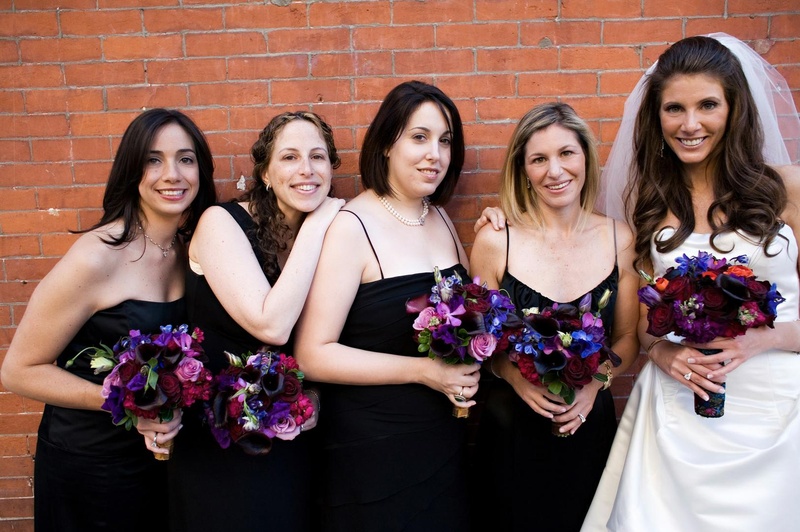 Brides Bridesmaids Photos Black Dresses Purple Flowers