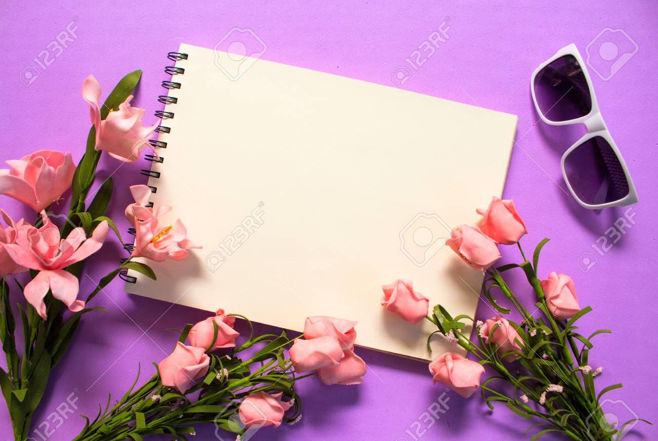 Rose Flower Frame Of Blank Page On Violet Background Romantic