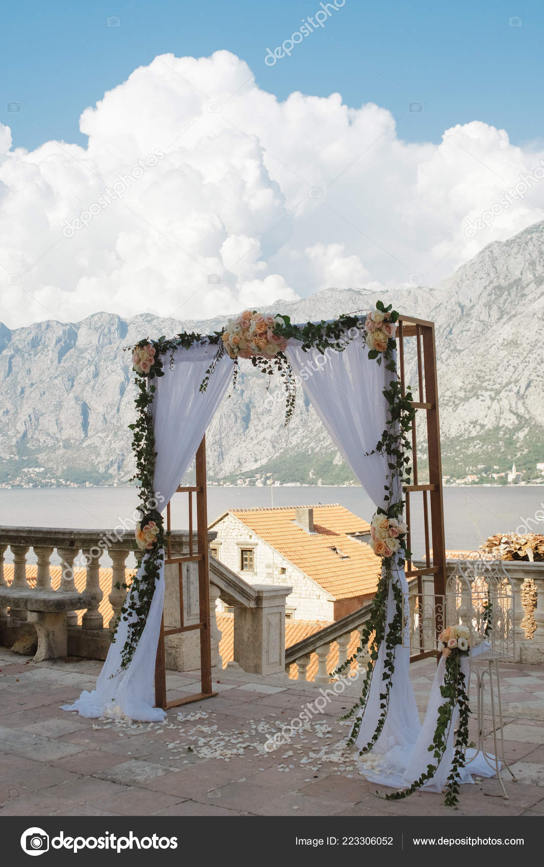 Beautiful Wedding Arch Flowers Next Mountain Sea Background