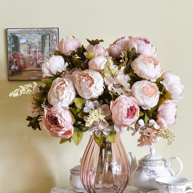 1 Bouquet Silk Flower Artificial Fall Vivid Peony Fake Leaf
