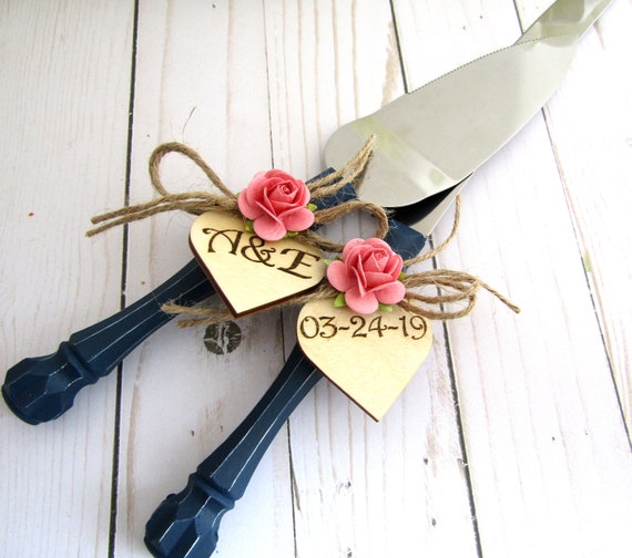 Rustic Chic Wedding Cake Server Knife Set Navy Blue With Coral Etsy