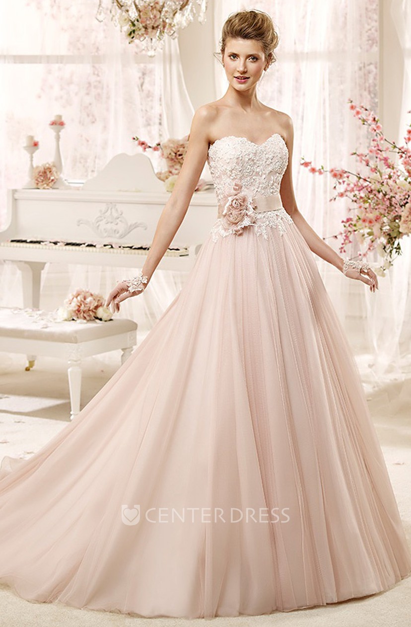 Lovely Strapless A Line Wedding Dress With Flower Sash And Pleated