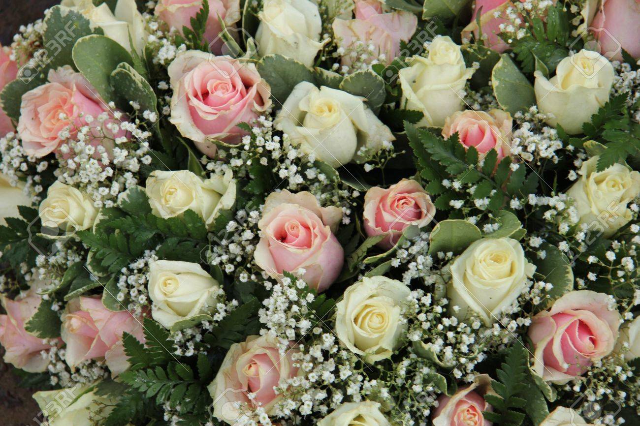Wedding Flowers In Pink And White Roses And Gypsophila Stock Photo