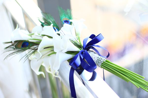Calla Lilly Ivory Teal Peacock Feathers Bride Bouquet Wedding