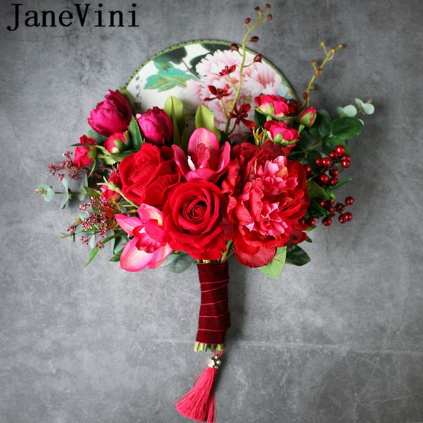 Janevini Chinese Style Bridal Fan Handmade Red Rose Bride Wedding