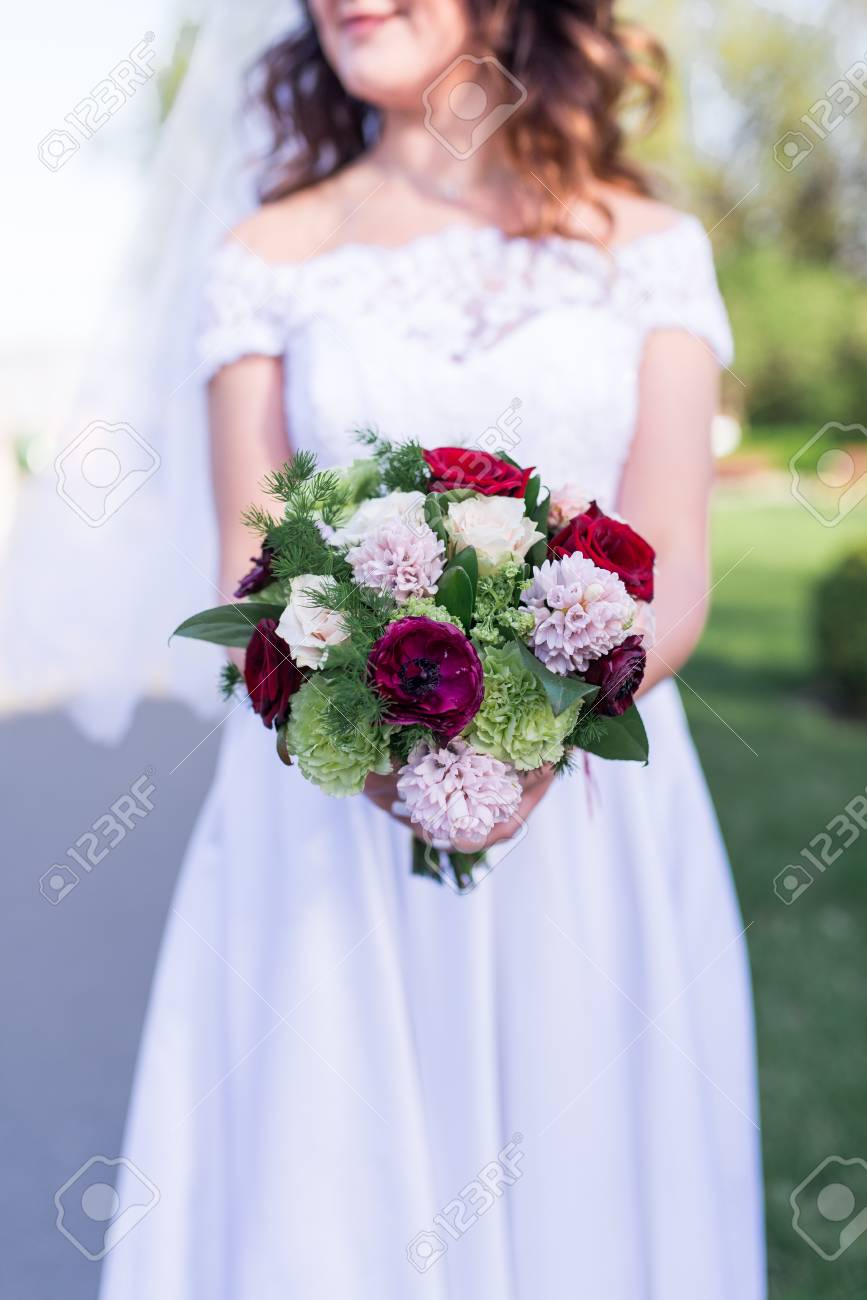 The Bride Holds A Wedding Bouquet With White Pink Red Flowers