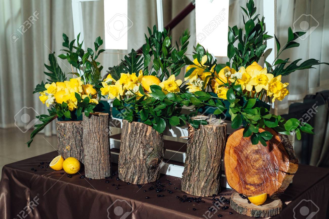 Wedding Flower Arrangements Of Yellow Daffodils Greenery And