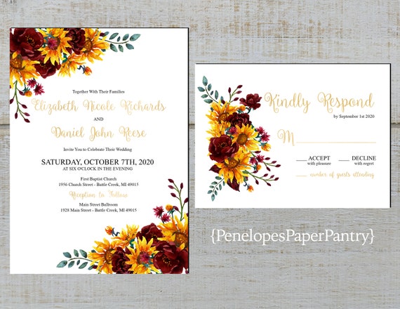 Elegant Sunflower Wedding Invitationssunflowersburgundy Etsy