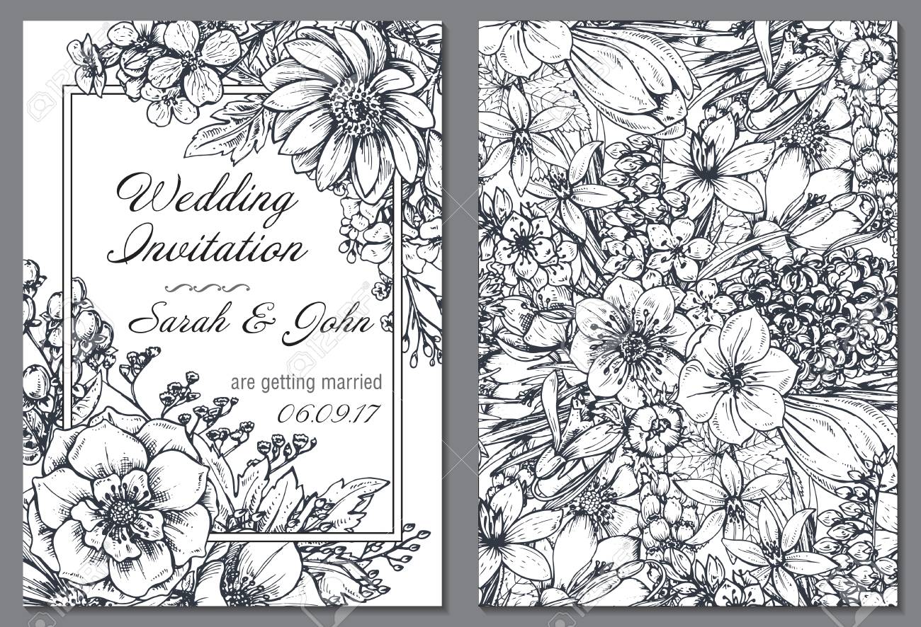 Wedding Invitation With Hand Drawn Spring Flowers And Plants