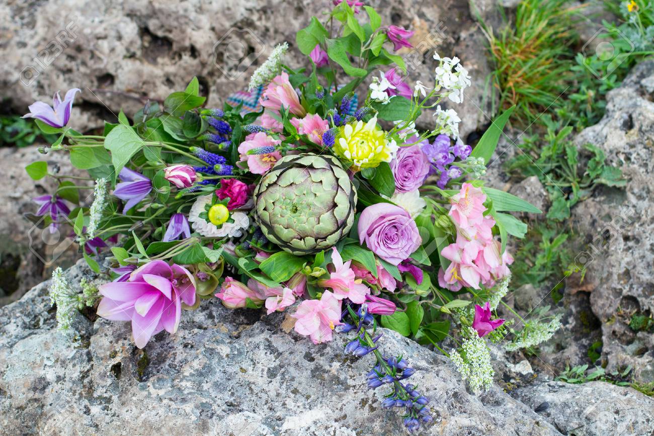 A Wedding Bouquet Of Flowers Lies On The Stones Stock Photo