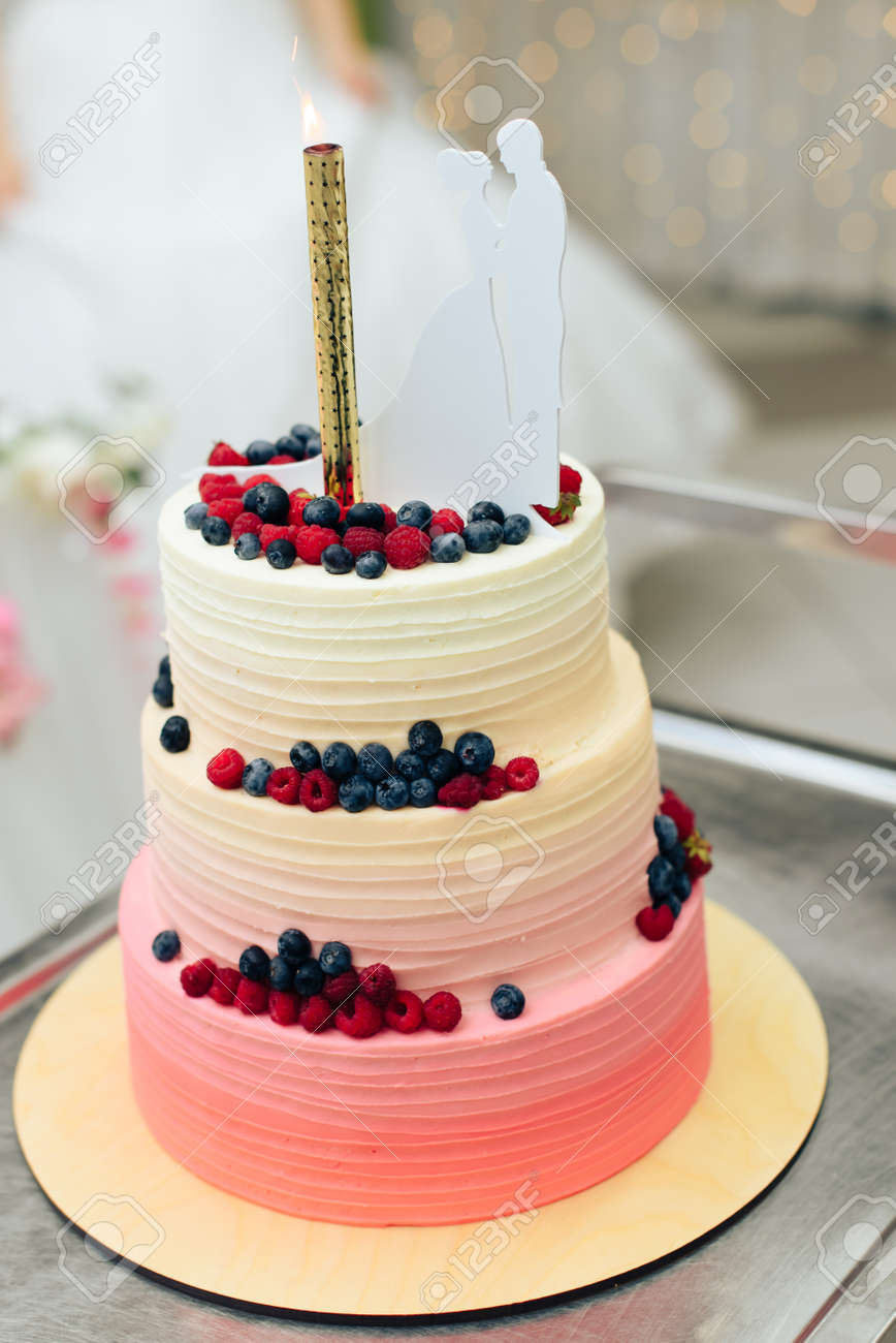 Beautiful Huge Wedding Cake With Flowers And Fruits Stock Photo