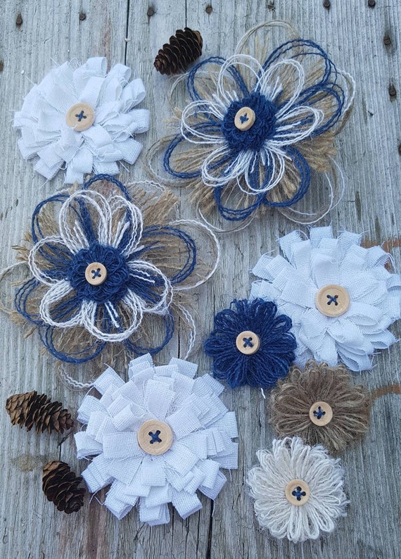Navy White And Natural Rustic Burlap Flowers Set Of 8 Rustic Etsy