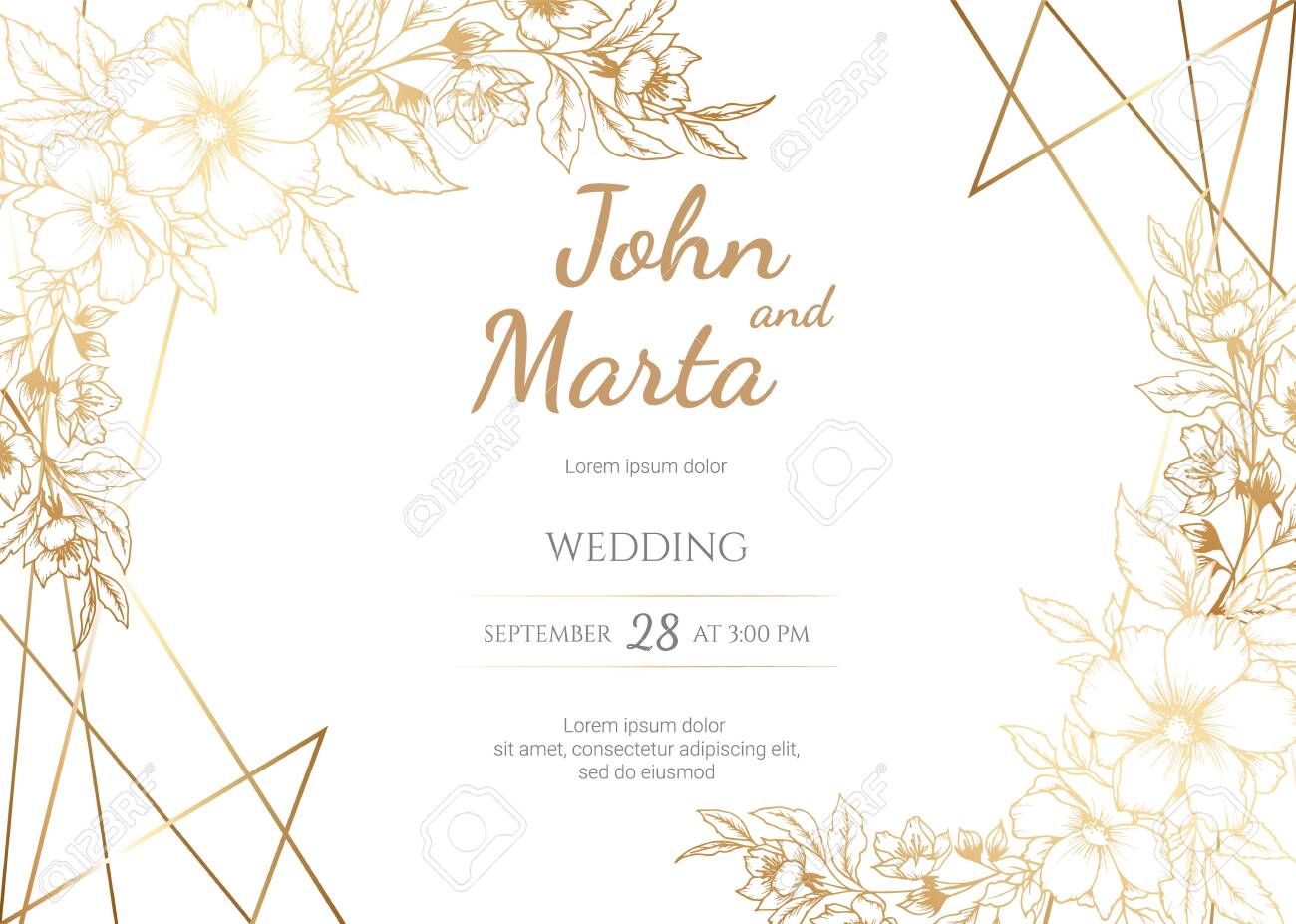 Wedding Invitation With Gold Flowers And Gold Geometric Line