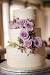 Vibrant flower topped wedding cake. This confection also features roses in muted lavender hues. Scattered down this purple themed beauty are roses with static muscari hydrangea and lilacs.