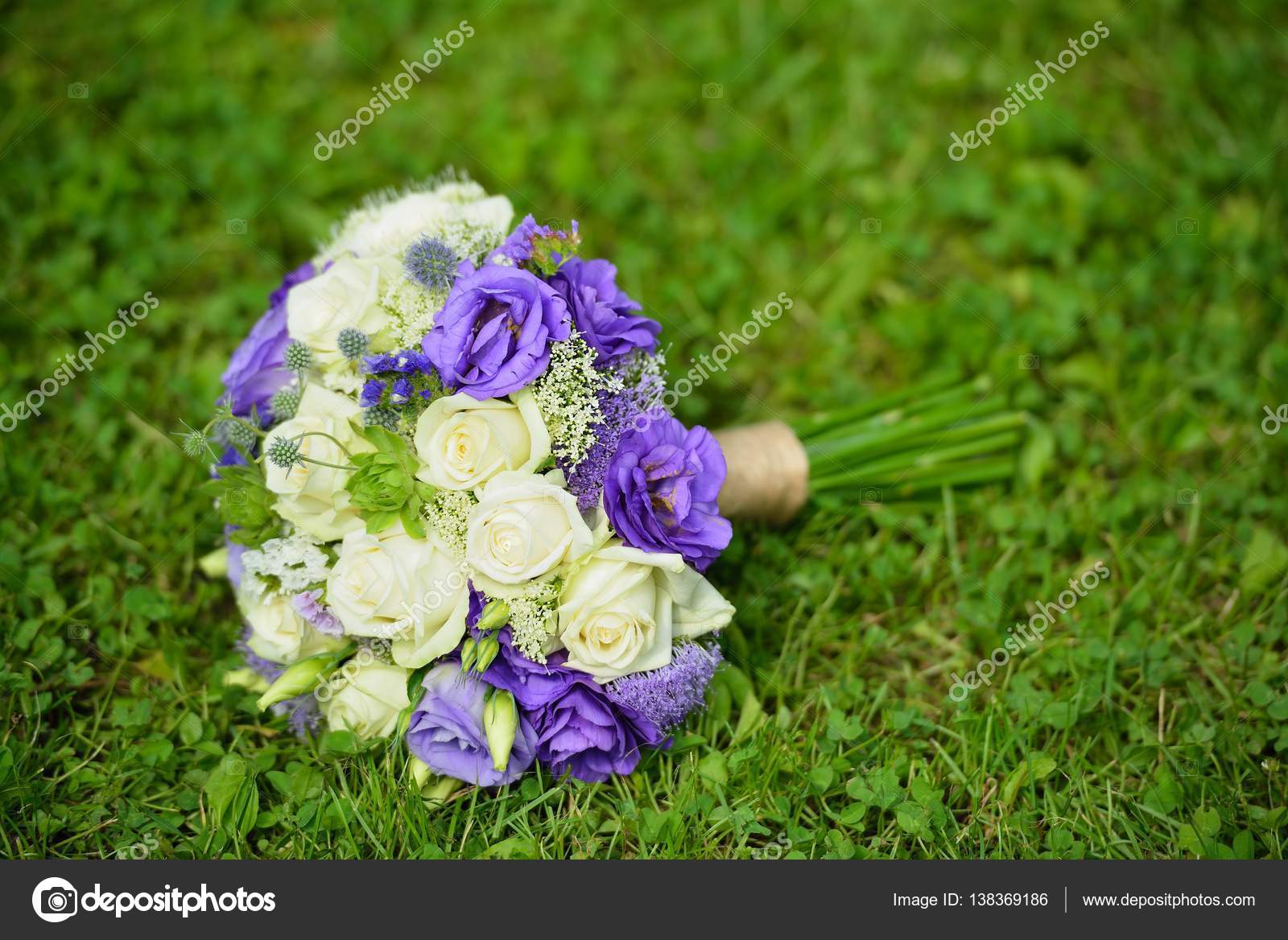 Close Up Of Wedding Bouquet With White And Purple Flowers On Green