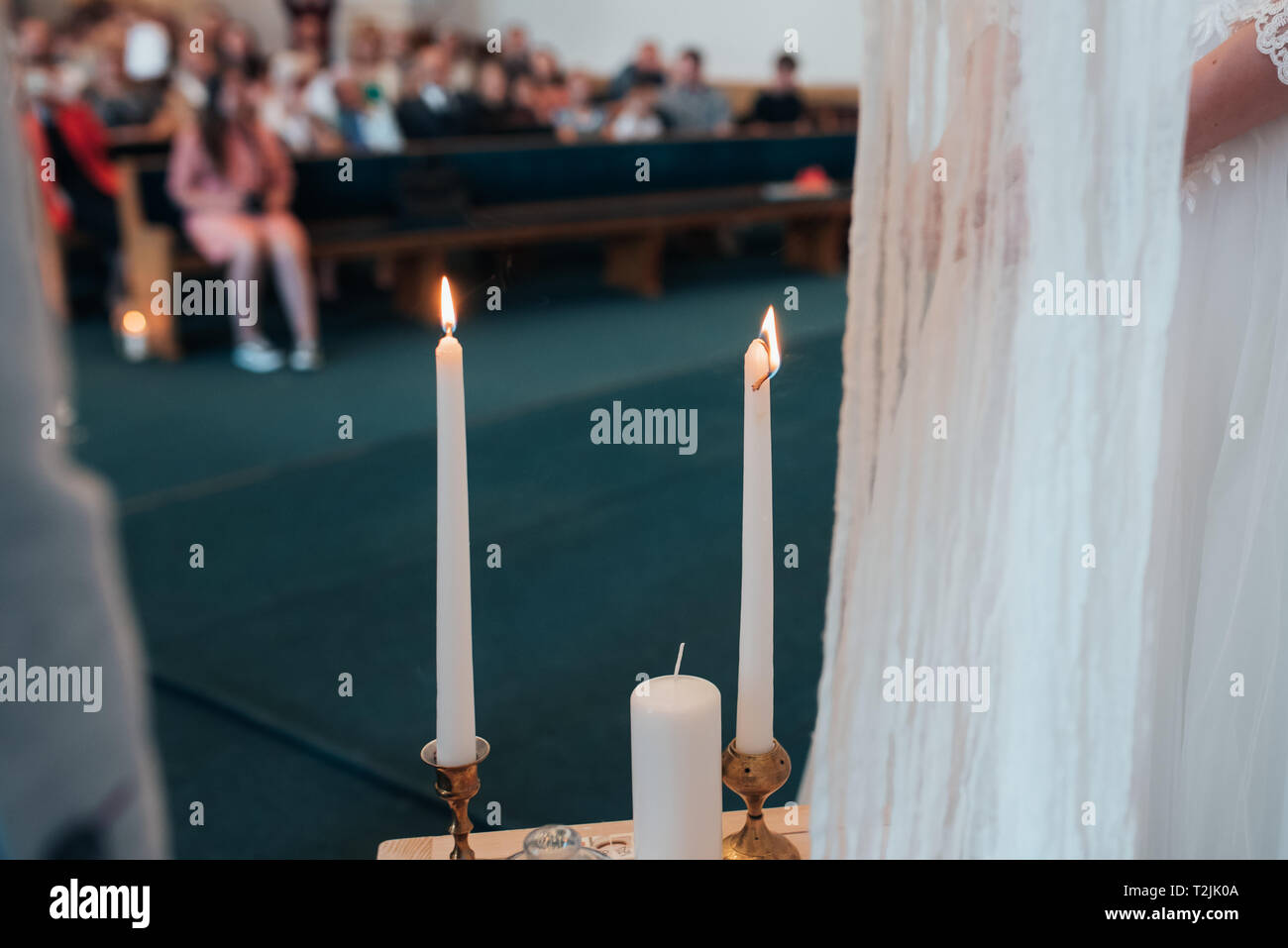 Small Wedding Table In White With Candles And Flowers Stock Photo
