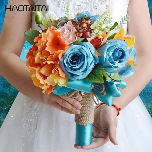 Royal Blue Pearls Bridal Brooch Bouquets Crystal Satin Wedding