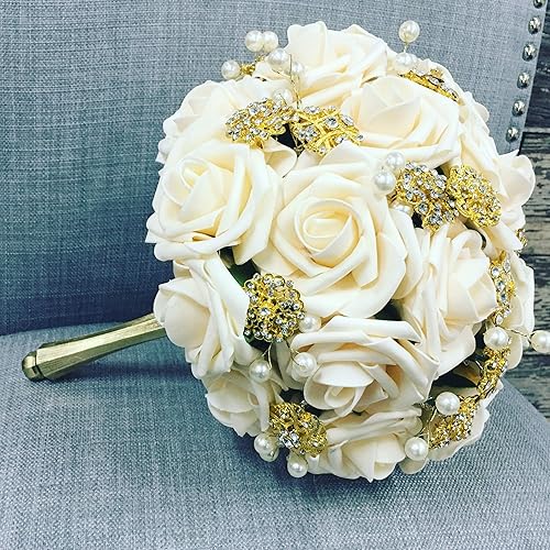 Amazon Com Gold Brooch Bouquet With Real Touch Cream Roses Gold