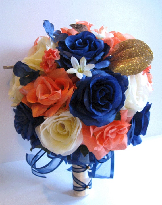 17 Piece Wedding Bouquet Package Navy Blue Coral Gold Etsy