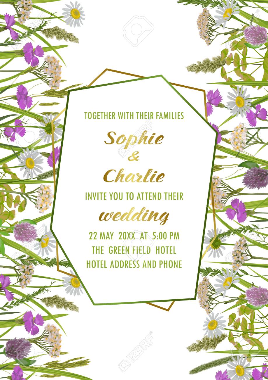 Floral Wedding Invitation Card With Geometric Gold Frame Herb Rose