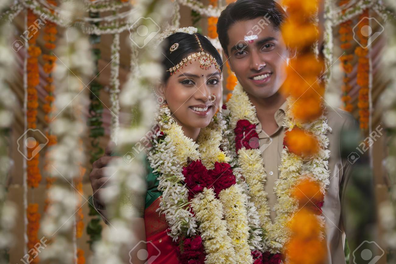 The Bride And Groom At The Indian Wedding Garlands Or Jaimala