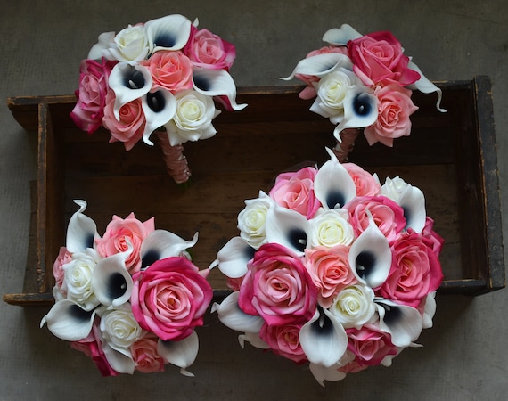 Hot Pink Navy Wedding Bouquets Real Touch Silk Roses Pu Calla Etsy