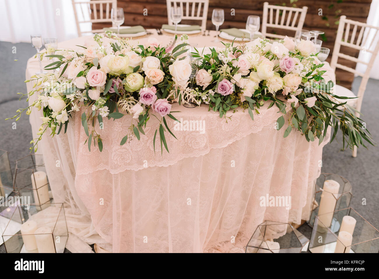 Wedding Floral Table Decoration With Candles In Transparent Vases