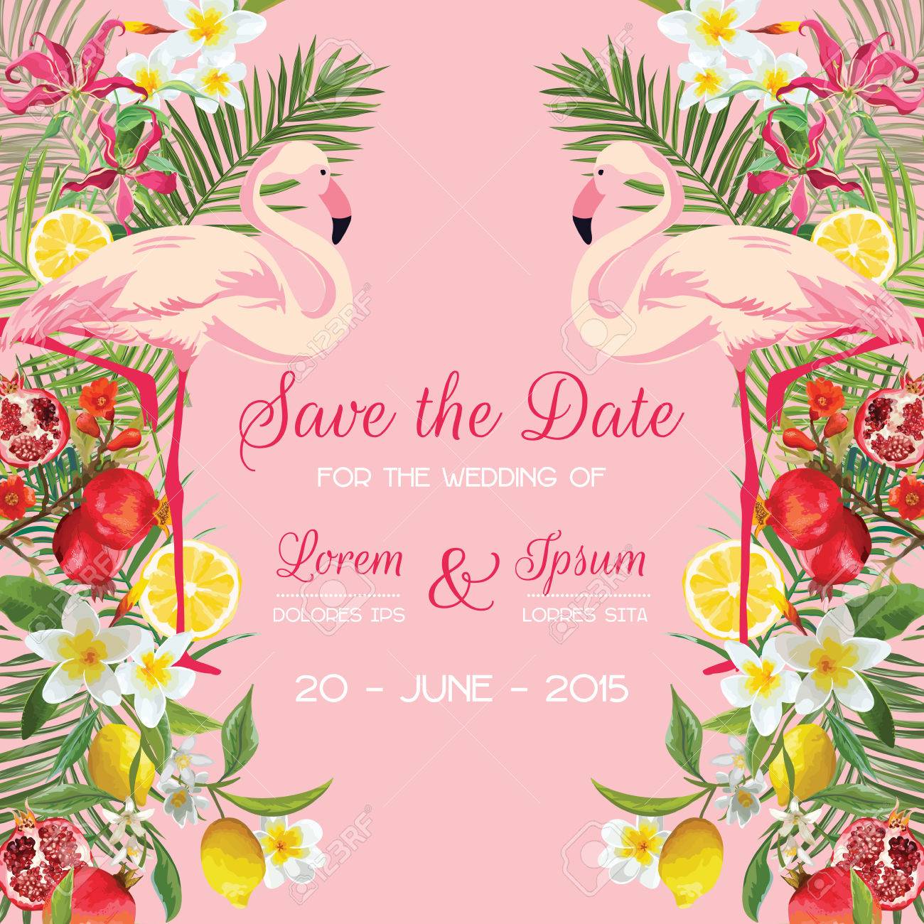 Save The Date Wedding Card With Tropical Flowers Fruits Flamingo