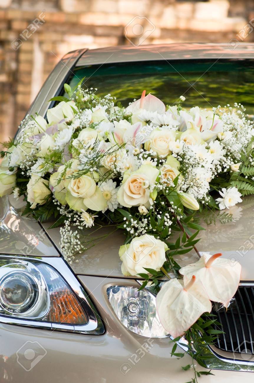 Big White Flower Bouquet On Wedding Car Vertical Shot Stock Photo
