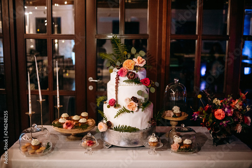 Delicious White Wedding Cake Decorated With Flowers Stands In The