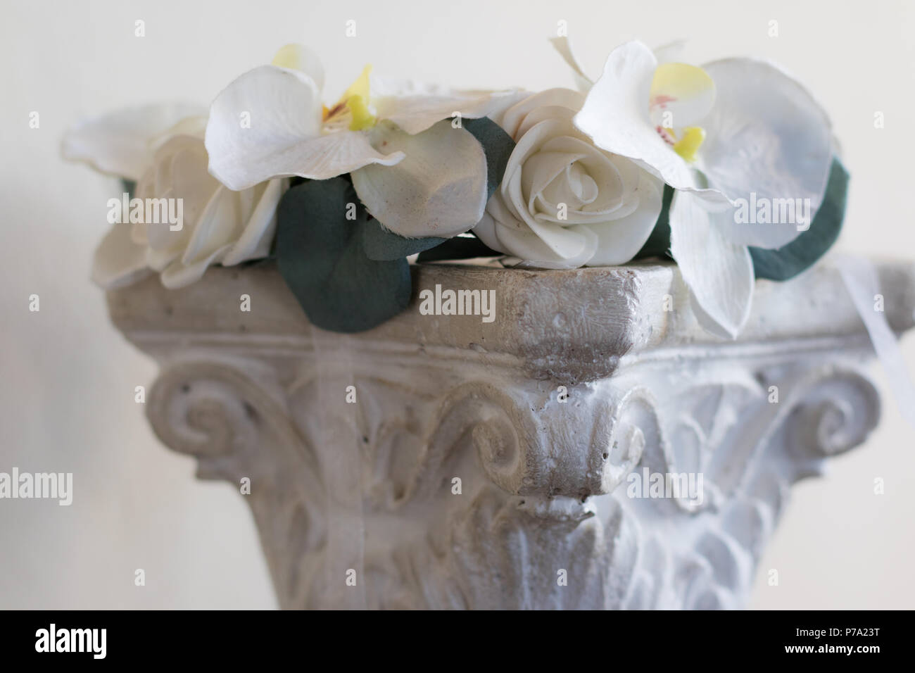 Orchids Roses And Pennygum Decorating A Pillar At A Wedding