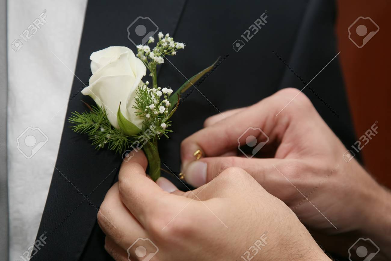 Help The Groom To Pin A Wedding Flower To Suit Stock Photo