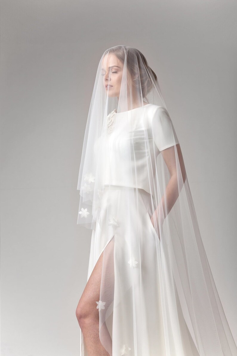 Unique Two Tier Veil Cathedral Wedding Veil With 3d Flowers Etsy