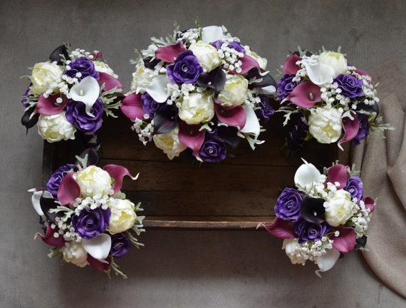 Plum Purple Wedding Bouquets Real Touch Calla Lilies Roses Etsy