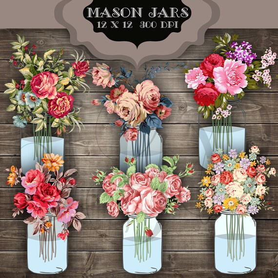 Wedding Clip Art Mason Jar Bouquet Digital Clipart Vintage Etsy