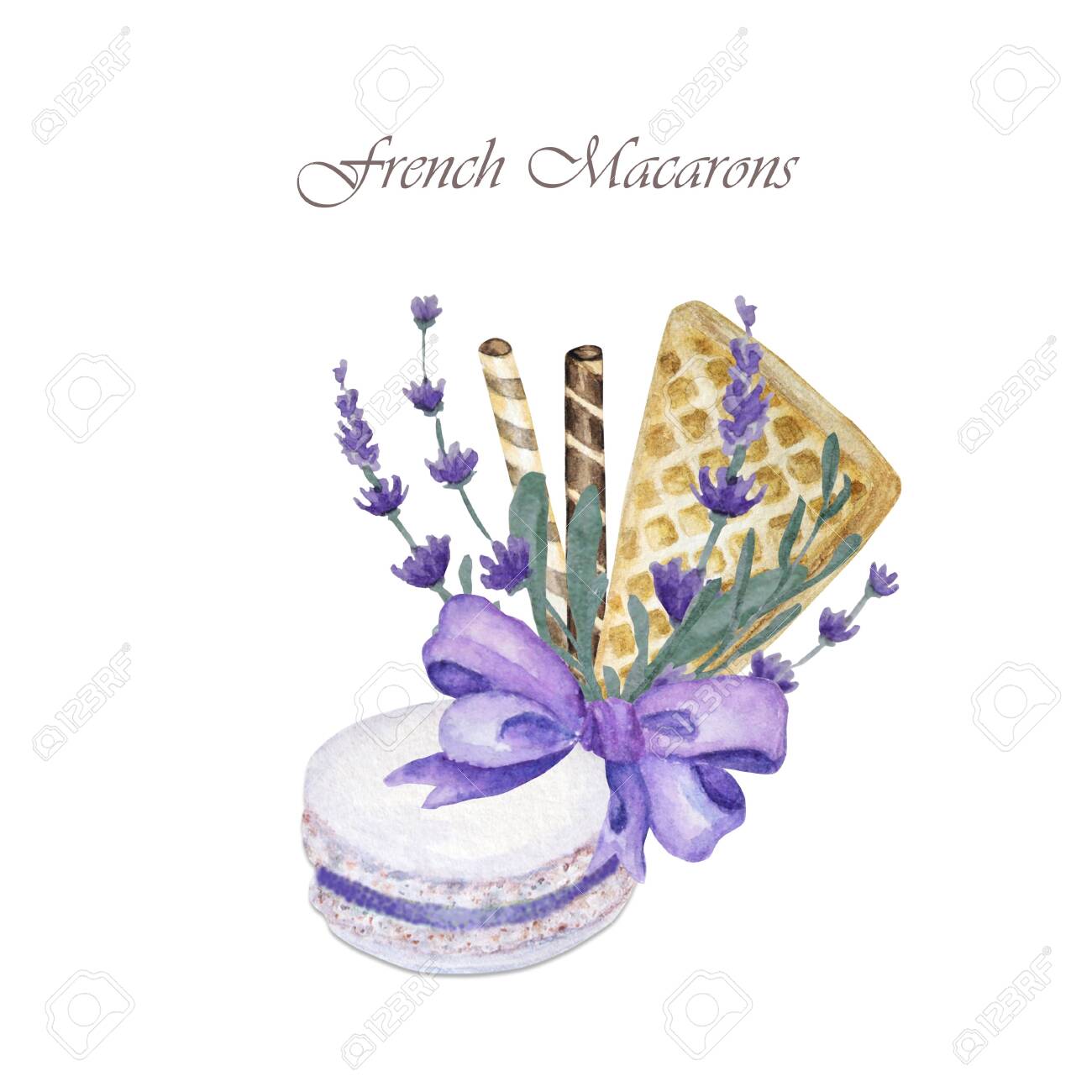 Hand Drawn Watercolor French Macaron Cakes Composition With