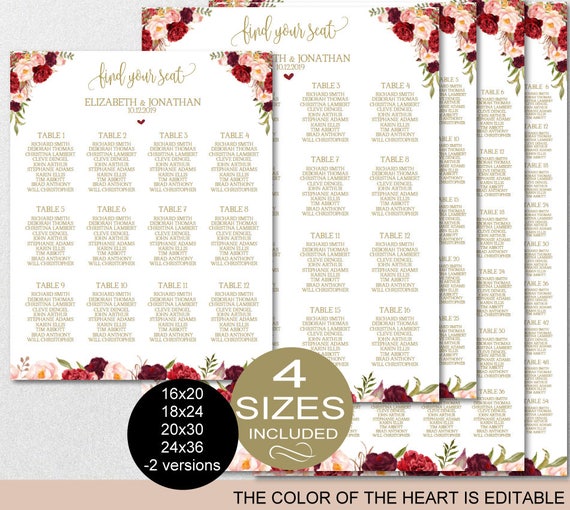 Seating Chart Template Wedding Floral Burgundy Peonies Etsy